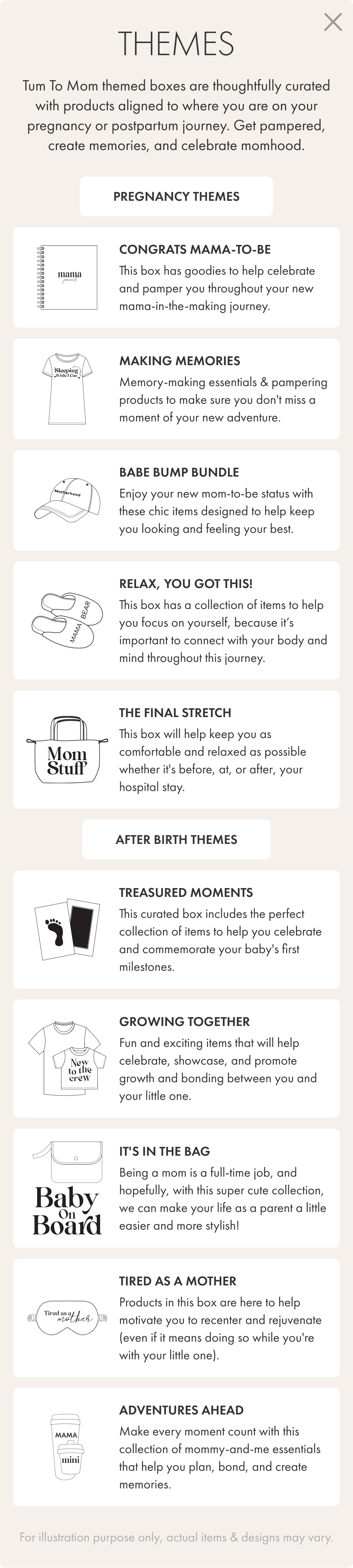 Tum To Mom Subscription can be started anytime during pregnancy and even after the baby is born, so it's never too late to start a subscription. Themes of boxes are curated to where the mom-to-be is in her journey to get the best experience.